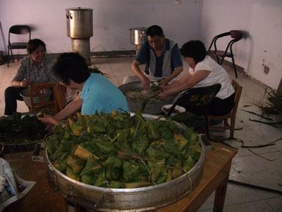 ??????? 我看到在房間窗下,還有一小堆洗好未煮的咸鴨蛋,淡綠色、粉白色看上去很新鮮,影影綽綽似乎看到里面的紅心兒。從準備包粽子,精選材料,到這兩天的制作和蒸煮粽子,居委會盡心盡力,不辭辛苦;幾位包粽子的師傅一坐就是半天,幾分鐘才包好一個粽子;他們靈巧的雙手不閑著,一個接一個把葦葉和糯米、花生、蜜棗、鮮肉變成了可愛的粽子,看上去很神奇。為了讓那些家在外地的單身大學生員工吃上美味可口的粽子,他們不顧天熱,不辭勞苦,傾注了深情,把利達公司對單身大學生員工的關愛、信任、期望包進了端午粽子中。