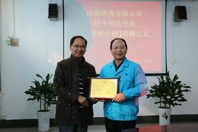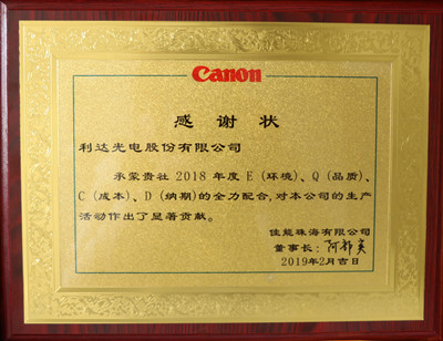 利達(dá)光電榮獲佳能珠海有限公司2018年度優(yōu)秀供應(yīng)商